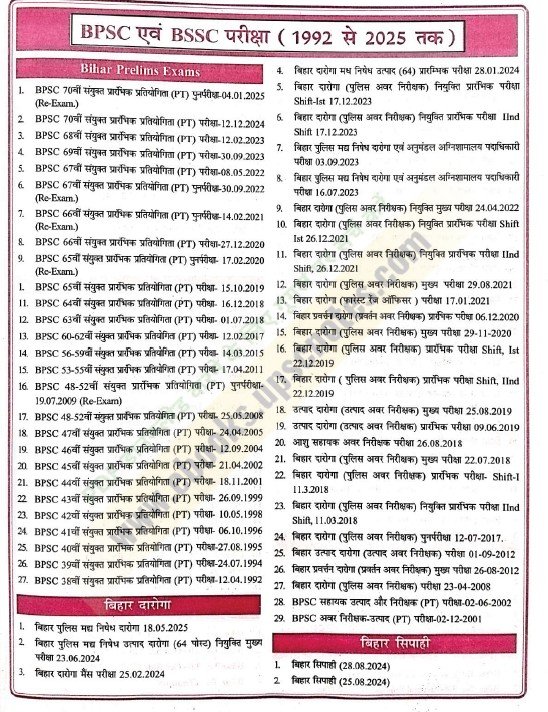 पुस्तक में पिछले 30 वर्षों (1992 से 2025) तक के BPSC और BSSC परीक्षाओं में पूछे गए प्रश्नों का विस्तृत विश्लेषण और समाधान शामिल है।