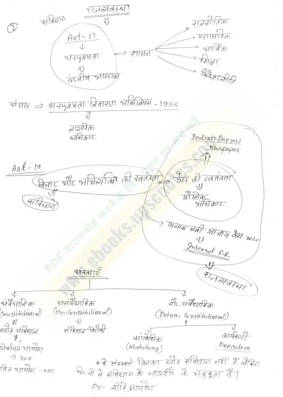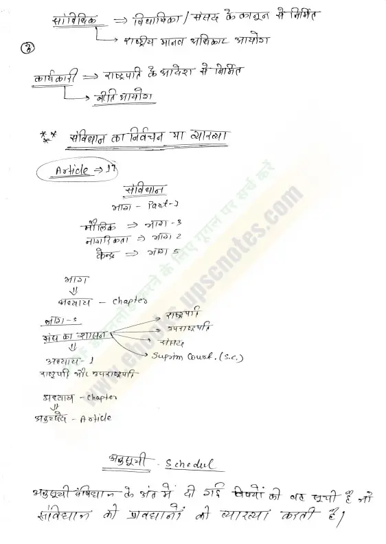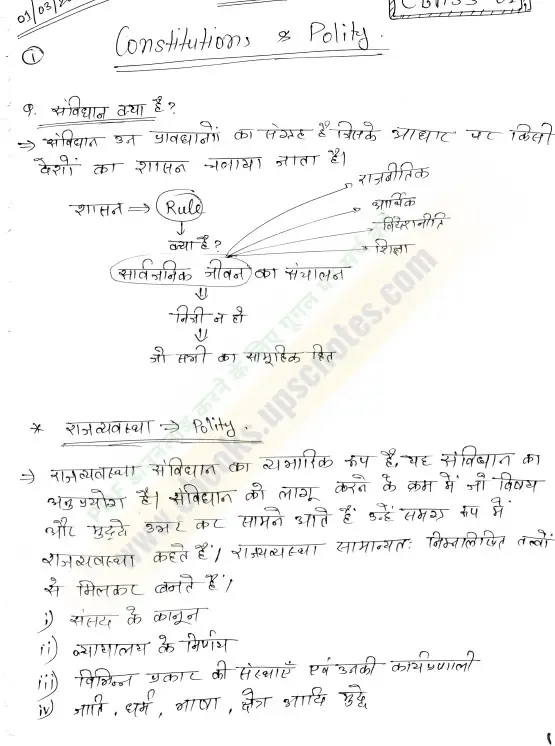 राजव्यवस्था के इन नोट्स में संविधान की प्रस्तावना, मूल अधिकार, राज्य नीति के निदेशक सिद्धांत, केंद्र-राज्य संबंध, संसद, न्यायपालिका, निर्वाचन आयोग, संघीय ढांचा, और संवैधानिक संस्थाएँ – सभी टॉपिक समग्र रूप से शामिल हैं।